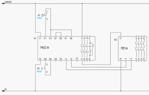 我們可以把一個簡單的控制電路分成信號輸入部分(如急停按鈕、限位開關、光柵)、控制部分(如繼電器、PLC)和輸出部分(如控制電機用交流接觸器)。根據EN 954-1中安全等級的描述,若要達到安全等級2級及其以上,控制部分必須使用安全的元器件,如安全繼電器、安全PLC等。在所使用的安全繼電器達到要求的安全等級的基礎上,我們通常可以通過信號輸入部分的接線來判斷等級2、3、4。我們現在以急停按鈕為例,分析這三個安全等級的應用接線。