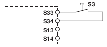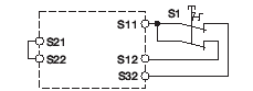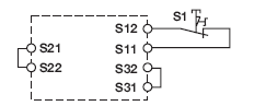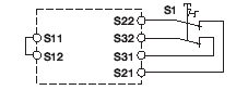 如果是雙通道不檢測觸點(diǎn)間短路故障工作方式的話則是短接S21和S22,兩個(gè)常閉觸點(diǎn)分別置于S11和S12,S11和S32之間。